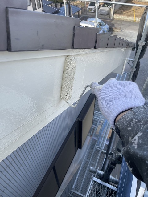 外壁塗装下塗り作業・付帯部の塗装作業が終わり、続いて外壁塗装中塗り作業へ入ります。フッ素塗料(遮熱あり)を使用します。 強風が吹きませんように!