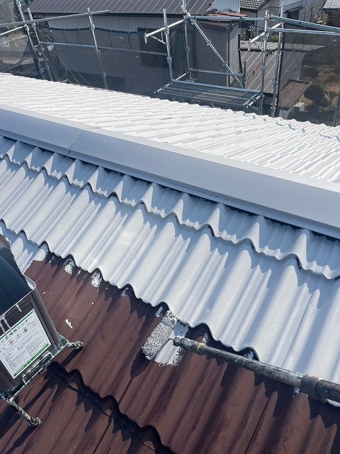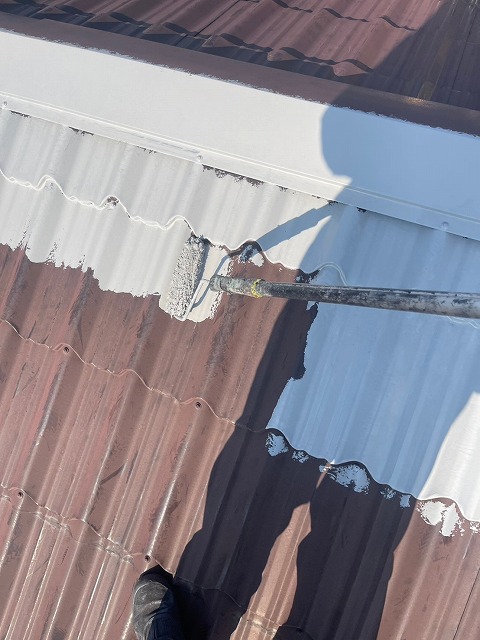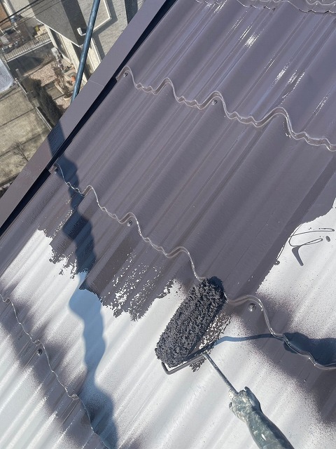 深谷市萱場で金属屋根塗装。下塗りプライマー塗布後に、中塗りはフッ素塗料を使用。