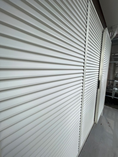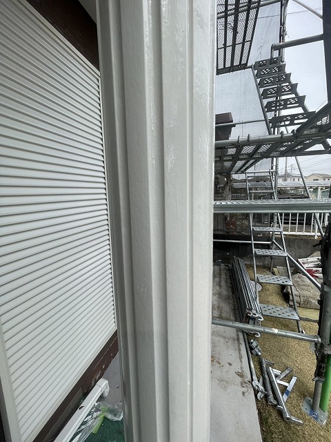熊谷市村岡で外壁塗装中。終盤の作業で玄関照明、雨樋、雨戸・玄関ポーチ柱塗装。