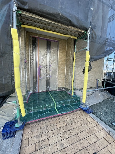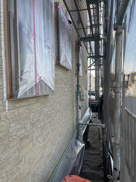 深谷市東方で外壁塗装が始まりました。高圧洗浄~養生作業の様子です。