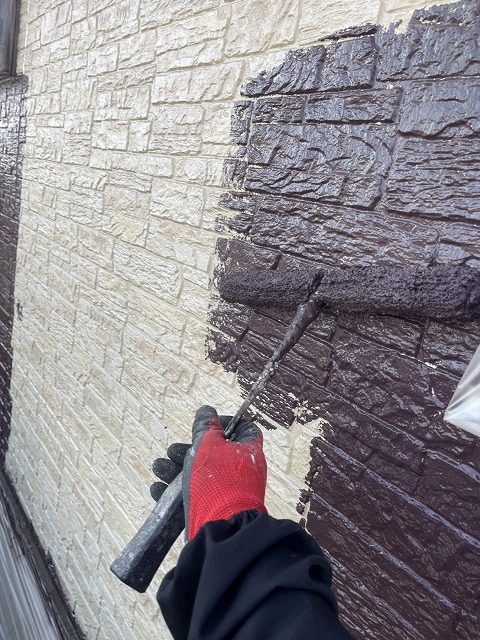 深谷市東方で外壁塗装。破風板・雨樋塗装と中塗りの様子。