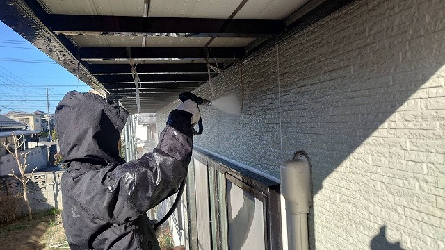 寄居町富田で外壁塗装が始まりました。遮熱フッ素塗料を使用します。
