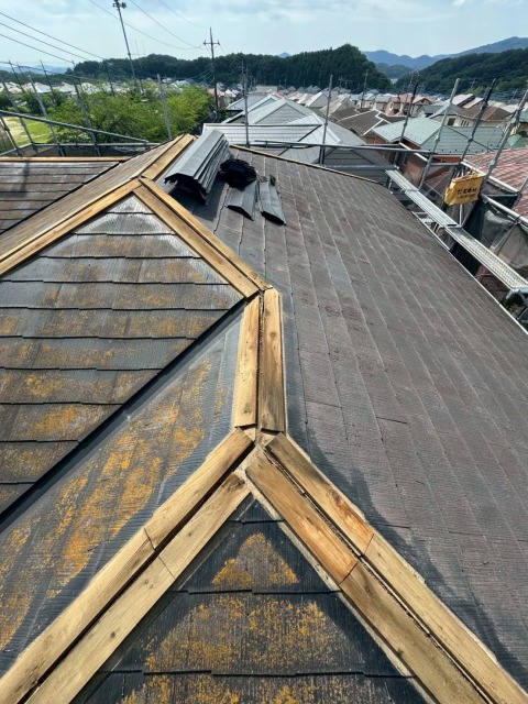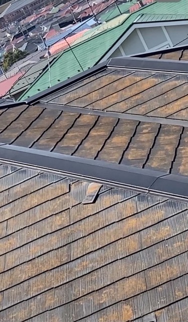 屋根はコロニアルで、色褪せ、苔・カビの発生が見られ、割れている箇所がありました。