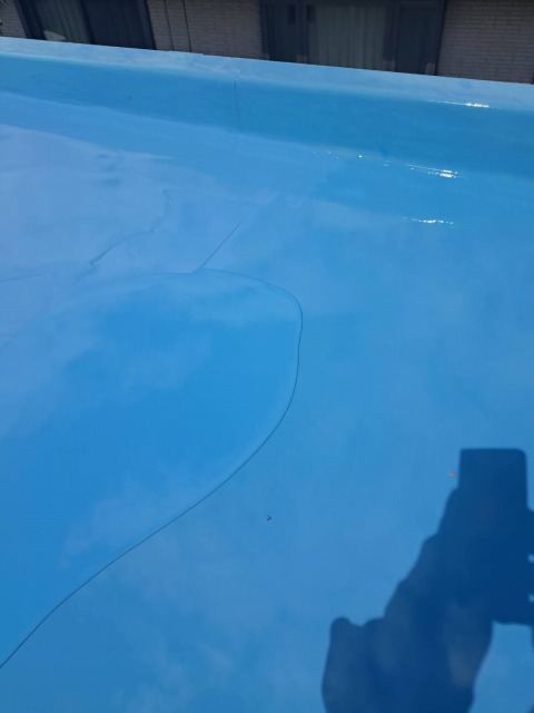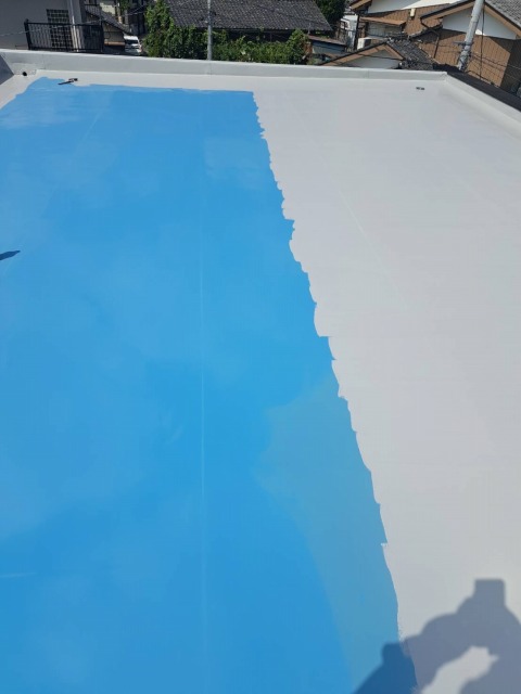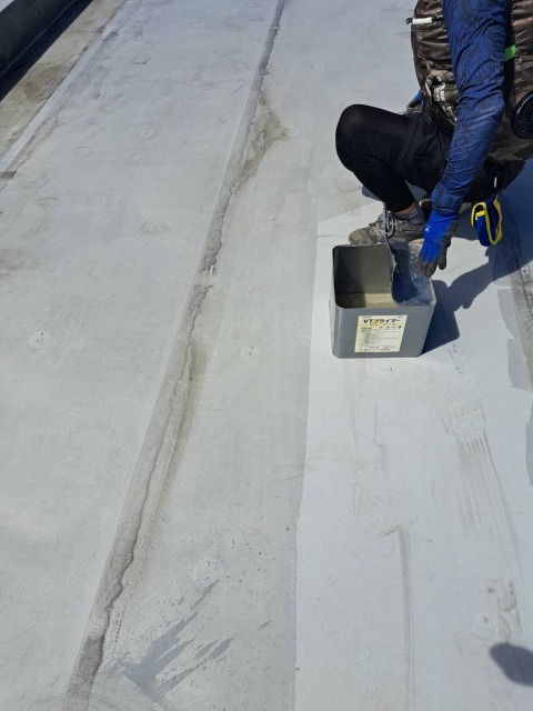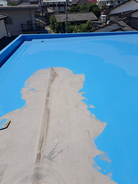 塩ビシート防水に、ウレタン防水を行い、シート防水の長寿命化を目的とする「重ね施工」をご提案いたしました。