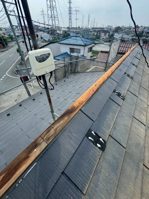 本日5軒の工事を進めています! 1.深谷市永田のお寺にて雨押えを付けています。 お寺が雨漏りしているので直したいと、役員さんから問い合わせをいただき、屋根の葺き替え工事をすることになりました。2月15日から始め、屋根葺き替え工事は終わり、残すは雨押えの作業のみです。*雨押え・・屋…