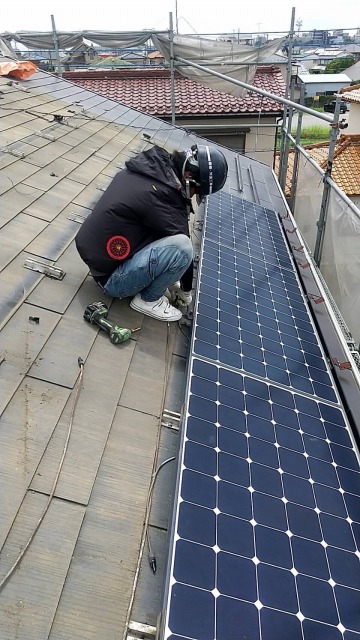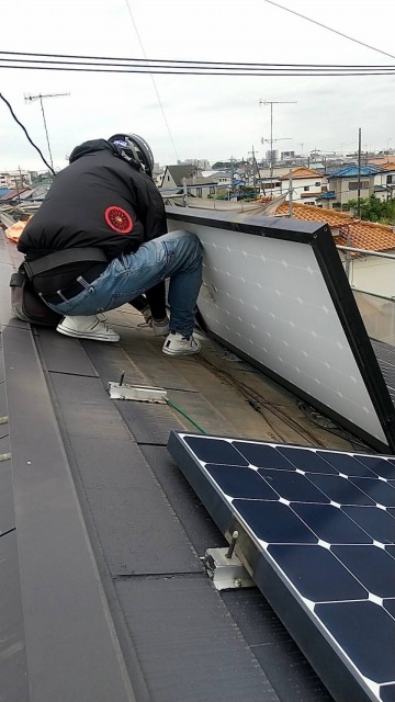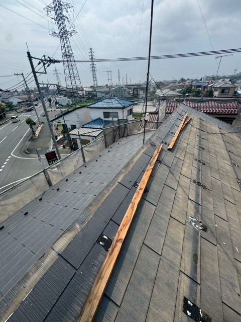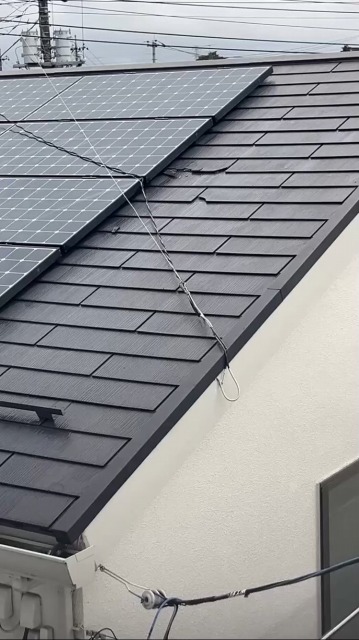 熊谷市で割れてしまったスレート屋根をカバー工事。太陽光パネルは脱着。